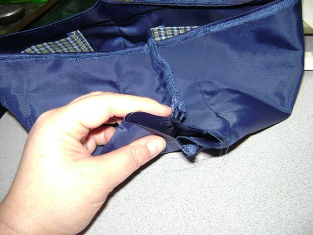 Ahora apriete la bolsa a través del orificio en la parte inferior del revestimiento hasta que se lado derecho hacia fuera. dejar la funda sobresale para que puedan cerrar el agujero. el sujetador de la guarnición para que los plano pone mal lados juntos. coser por el borde como cerca del borde de la costura inferior. que desea ser como mínimamente visible como sea posible. Empuje el revestimiento interior del cuerpo del monedero y cambiar la forma.