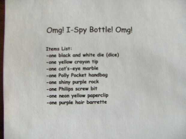 Esta es probablemente la parte más fácil. Ir a Microsoft Word o lo que sea y escriba algo como: "Botella de espía" en sobre tamaño 16 de fuente. A continuación, escribir la lista de artículos acerca de fuente tamaño 10. Las imágenes muestran lo que debe buscar como escrito arriba y en la botella.