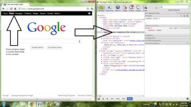 En Google, en la parte superior hay etiquetas (nosotros, imágenes, etc...) Con F12, puede cambiar el tamaño. Cuando tu en las herramientas de desarrollador, ir a < Head > < estilo > y escribe cualquier número