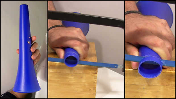 Tomé la bocina y cortar 2 piezas. Como tubo de cuernos es cambiar de diámetro, una pieza debe ser más ancha que otro.