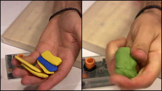 Mezclé 4 partes de amarillo y 1 parte de azul, para obtener un Sugru verdoso.