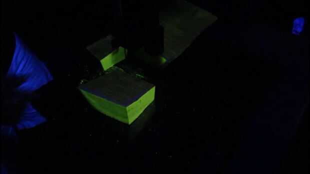 Se trata entonces de en la Sierra de banda y haciendo el corte. Se puede ver que "el resplandor" es mucho más brillante en la madera recién cortada. Es posible que la pulsera terminada puede desaparecer con el tiempo, pero no estoy seguro de cuánto tiempo tomaría.