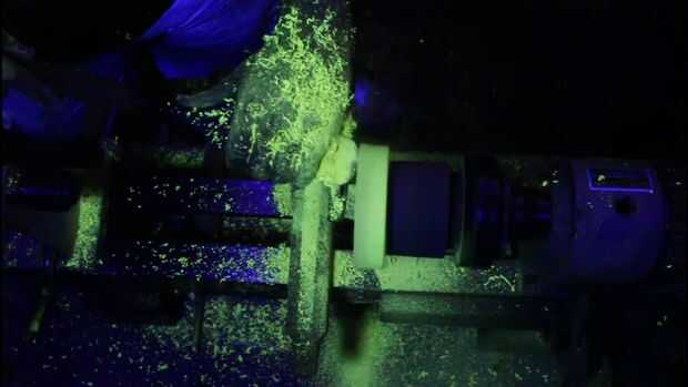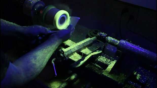 Utilizando un mandril de jamba para sujetar la pulsera en su lugar, usted puede entonces limpiar el lado de la misma manera que la parte superior de la pulsera. Lo curioso acerca de la luz negra aquí: las virutas más que el más brillante se convierte en el área de trabajo. Como trabajaba, luchó a mi ser interior y dejó el torno como sucio y cubierto de afeitar como pude!