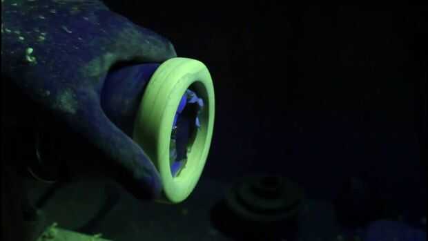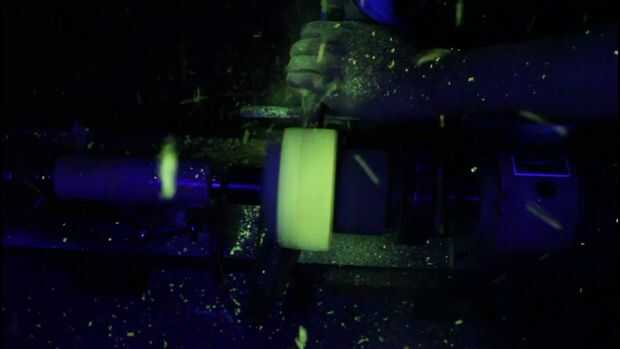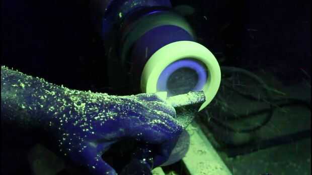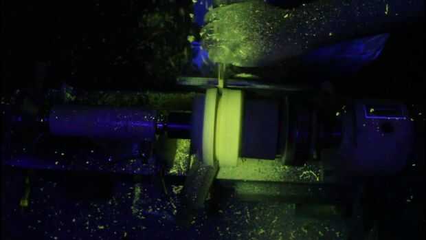 Este es montado en mi torno y asegurado con un bloque de madera en ambos lados. Por supuesto nada de eso es visible bajo luz negra. Usted gire hacia abajo con la gubia desbastar hasta tener un cilindro liso con manchas no más planas.