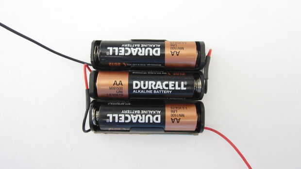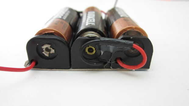 Cada una de las baterías está montada en un soporte de la batería AA. Los cables de los titulares de la batería están conectados en serie (positivo a negativo) para formar un 4, 5V batería. Aislarse cada conexión con un trozo de tubería del encogimiento del calor. Para unir las baterías, utilicé pegamento caliente para fijar los soportes de tres batería a un pedazo de cartón.