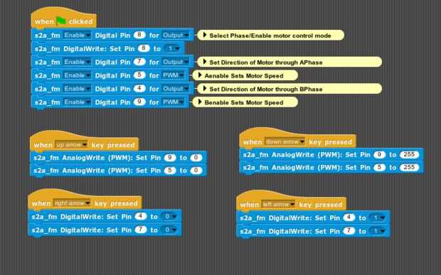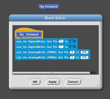 Para ilustrar, echemos un vistazo a las capturas de pantalla arriba. La primera captura de pantalla muestra un conjunto de secuencias de comandos para control motor básico utilizando los bloques de s2a_fm . Este podría ser un nivel apropiado de detalle para una clase de alumnos avanzados explorar microcontroladores, pero no para una clase de estudiantes del principio. En la segunda pantalla, podemos ver la definición de "Hacer un bloque" un mayor nivel de bloque "Ir adelante". Fue creado simplemente por cortar y pegar algunos de los bloques de s2a_fm en el nuevo bloque. Un completo conjunto de bloques de funcionalidad simplificado se muestra en la tercera pantalla. Todos los bloques simplificados fueron creados de los que en la primera pantalla simplemente cortar y pegar. La tarea completa de conversión de la escritura de la primera al conjunto de bloque simplificado tomó unos 10 minutos.