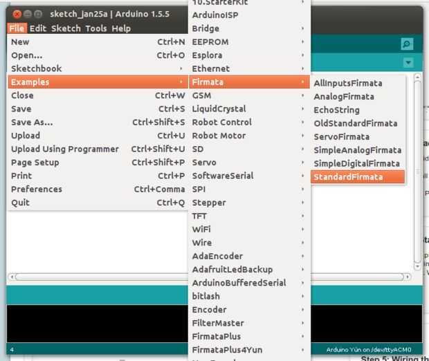 Después de instalar StandardFirmata, reset el tablero (se pueden quitar el cable USB y vuelva a conectarlo), el LED etiquetado L13 (sobre el Yun) o L (de las otras tarjetas) debe flash un par de veces y luego apagar. StandardFiramata parpadea el número de versión.