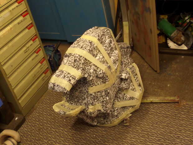 Otra manera interesante de acercarse a este podría ser usar pepakura para hacer una estructura gigante de cartulina en una resolución baja y tal vez rellenar la cavidad con la expansión de la espuma. Como siempre hay varias alternativas.