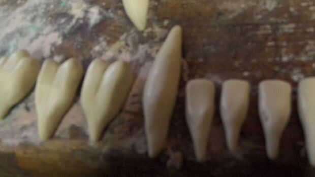 Usando este adamantium de polímero descubrí, había esculpido de cada diente y había cocido en el horno. Usando un pulidor mop en una esmeriladora de banco dio los dientes un pulimento sutil, si yo hubiera querido un brillo completo hubiera usado una laca pero pensé que más de un final del satén habría sido más adecuado. La mezcla de rouge y Trípoli (verdes y rojos) compuestos de pulido hizo un residuo de aspecto sucio en las fisuras de los dientes, que decidí mantener porque realmente parecía como un efecto de erosión realista.