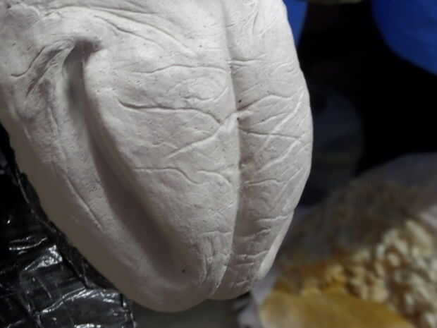 El otro puntero para utilizar arcilla DAS debe prestar mucha atención a la hidratación de la arcilla. Usted puede notar que algunos paquetes de DAS salen el paquete más hidratado y maleable que otros, así que es muy importante que mantenga libre DAS en un ambiente hermético y tener siempre un recipiente con agua cerca para hidratarlo. Además, no siempre es mejor tenerlo a tan húmedo como sea posible, a menudo encontrará que diferentes operaciones funcionan mejor en diferentes niveles de humedad. Por ejemplo, haciendo una forma mejor es hecho tan húmedo como sea posible, pero usted puede esperar antes de añadir las arrugas para dejar que la arcilla seque un poco. Esto es porque, cuando húmedo, puede tener más de una tendencia a romper las fibras haciendo una superficie irregular, mientras que cuando está más seco de las fibras puede ser más probable con la dirección del corte que usted está haciendo. Al agregar los poros como toque final, o las arrugas muy finas, encontré que era mejor esperar hasta que la arcilla era 50% - 70% secado completamente, porque en esta etapa sólo puede pulsar una herramienta en la superficie y la superficie reacciona alrededor de la herramienta. Por ejemplo si empujas un punto en la superficie para representar un poro, en lugar de simplemente hacer un agujero hace un hoyuelo - se trata de conocimientos muy útiles para esculpir texturas finas.