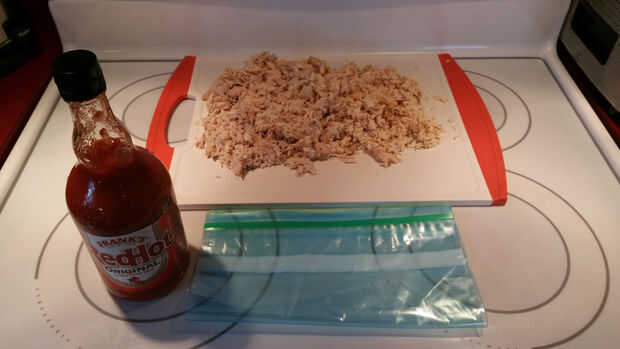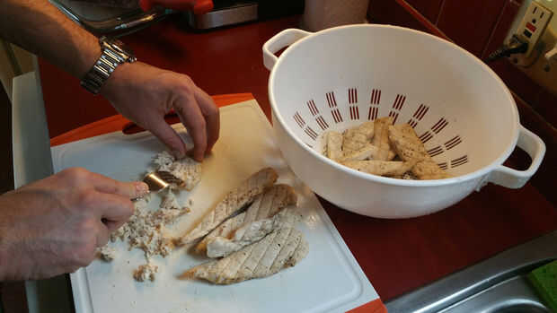 Con un tenedor, tire de las tiras de pollo aparte. Puede utilizar sus manos para separar el pollo así. Un cuchillo puede usarse para picar el pollo, aunque esto resultará en cubos pequeños de pollo en lugar de pollo tirado real. Estoy a favor del método de bifurcación como resulta en los fragmentos más finos de pollo.