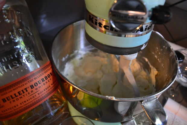 3. Con la batidora funcionando, agregue bourbon, 1 cucharadita a la vez, hasta que has usado todo.