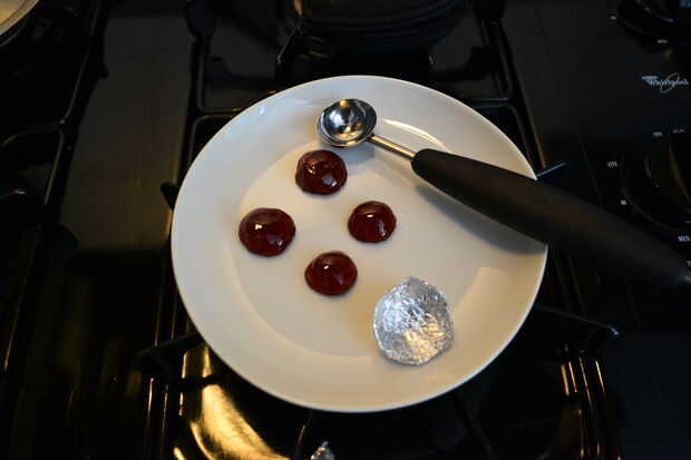 - Combine todos los ingredientes (azúcar, agua, jarabe de maíz) en una olla pequeña y calentar a 300 grados. (Use su termómetro para medir. Si no tienes un termómetro, calor hasta que la mezcla esté gruesa y toda el agua se haya evaporado, creando un jarabe viscoso.)