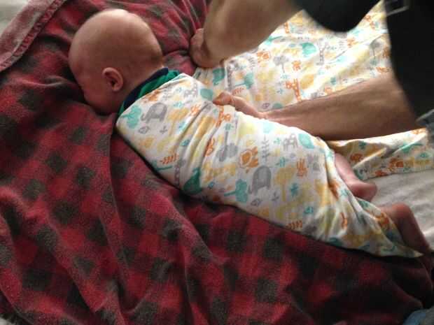 Rollo de su bebé a la derecha (su izquierda) hasta que son hacia abajo, fijando su brazo izquierdo a su lado. Coloque su mano derecha en su lado derecho, aplicando presión para mantener el brazo derecho cubrió, tome la parte libre de la manta con su mano izquierda y tirar de él lejos de su bebé para colocar firmemente. La mano izquierda debe tirar tan firmemente como sea posible pero no con bruscos tirones. Es normal que su bebé a gruñir cuando lo haga.