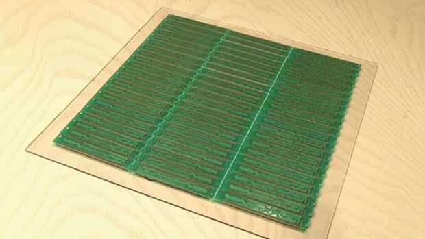 Empezar a maquetar la ram en el plexiglás. Quiere dejar aproximadamente 3/4" alrededor del borde del plexiglás porque es para un producto final de mejor aspecto, pero la elección es suya. Luego empezar a pegar el pistón hacia abajo en el plexiglás, chip hacia abajo. Que todo lo limpio y recto. Aquí su paciencia va a determinar cómo el Bytelight termina mirando.