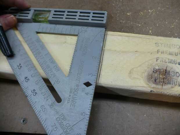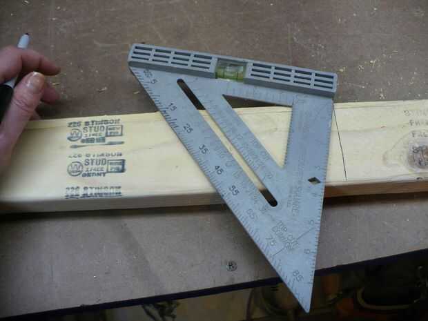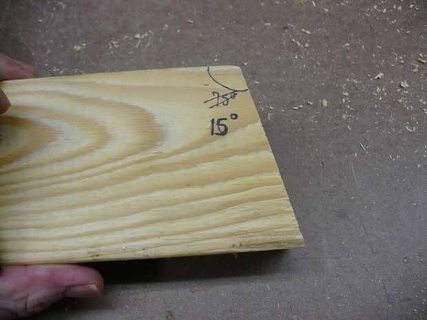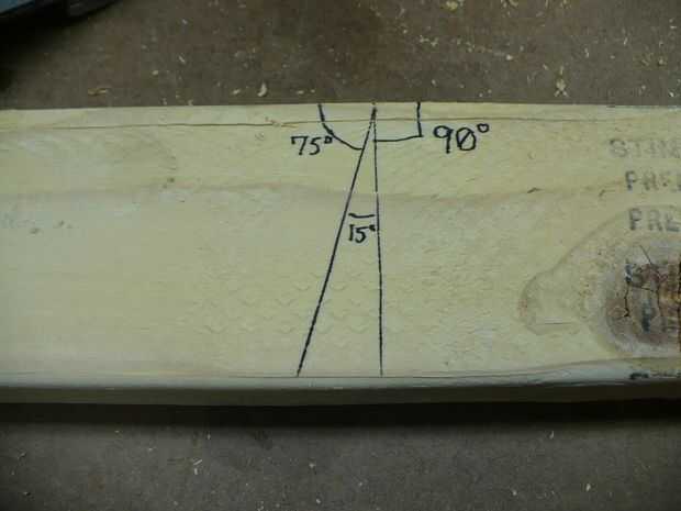 La imagen de abajo muestra la plantilla que hará más fácil todo este proyecto. Es un trozo pequeño de 2 x 4" con un extremo cortado a 15 grados.  Vamos a necesitar colocar un grado 15 corte por lo menos 8 veces en este proyecto, así que más bien la medida cada vez. Es mucho más rápido para cortar algo en ese ángulo y utilícela para marcar todos los ángulos que necesitamos. Su también se asegura que son todos iguales. Así que si usted y hasta con 14 o 17 grados en lugar de 15, no importa demasiado porque todos los ángulos serán de la misma cantidad.