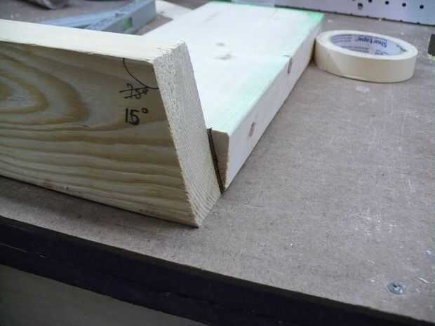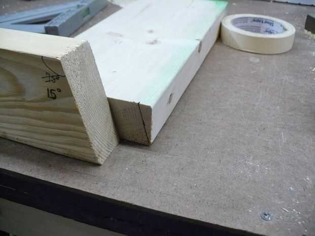 Paso 2 tome usted bloque angular (plantilla) y marca el final de la parte superior del carril con el ángulo de 15 grados a partir de la parte inferior fuera de la esquina de la baranda superior (vista desde el extremo) y trazar una línea desde la parte superior de la baranda superior hasta el fondo.