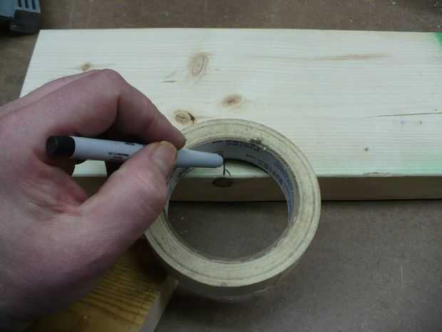 Paso B cuatro. Si usted está usando una sierra de calar o una sierra de banda de extender la línea usted marcó pasado 6 pulgadas marca y fuera de la curva al borde de la baranda superior. Puede hacerlo a mano alzada o rastreando algo circular.
