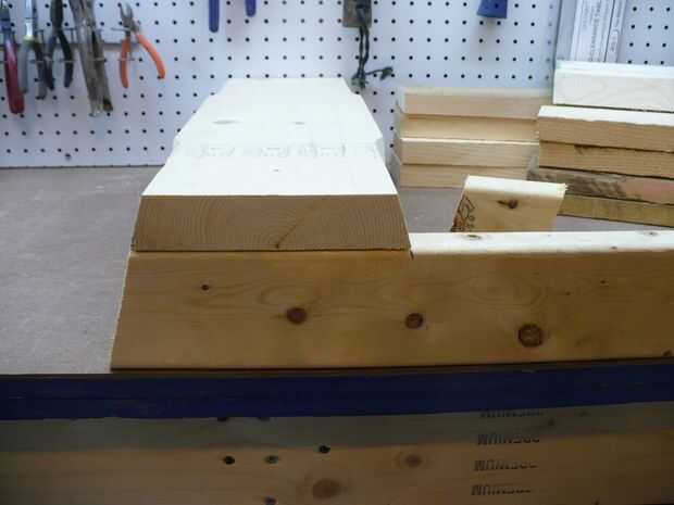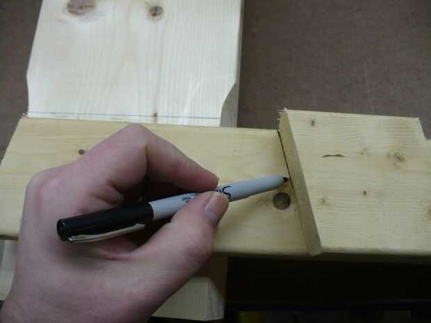 Recomiendo cortando cada tirante a la longitud de uno a la vez, la madera no siempre es el mismo de pieza a pieza.  Cortar el ángulo de 15 grados en un extremo. Alineados con el riel superior, marca el otro extremo de la abrazadera para la longitud y marque el ángulo con su plantilla de 15 grados. Puesto que se trata de un proyecto es siendo construido con tolerancias más bien flojas, te recomiendo numeración las llaves a medida que avanza. Especialmente si usted está construyendo más entonces uno a la vez que evitará confusión.