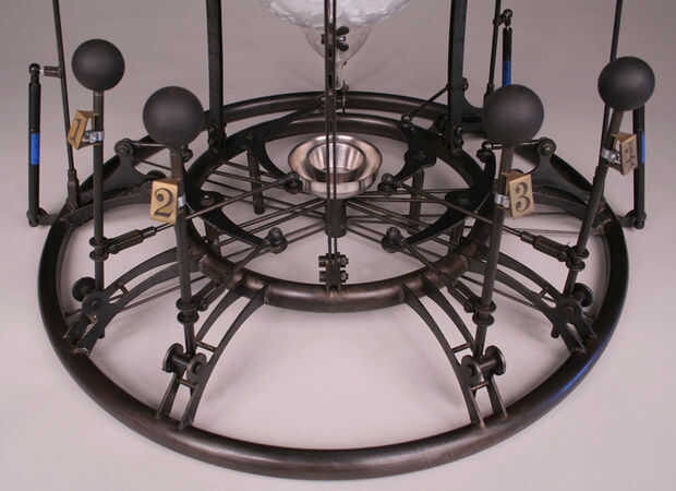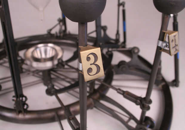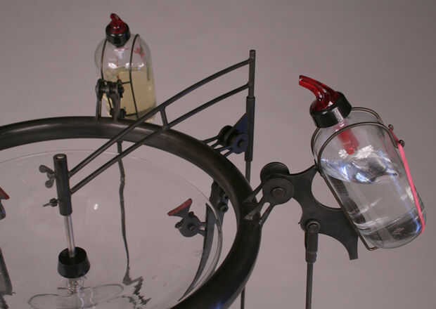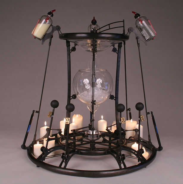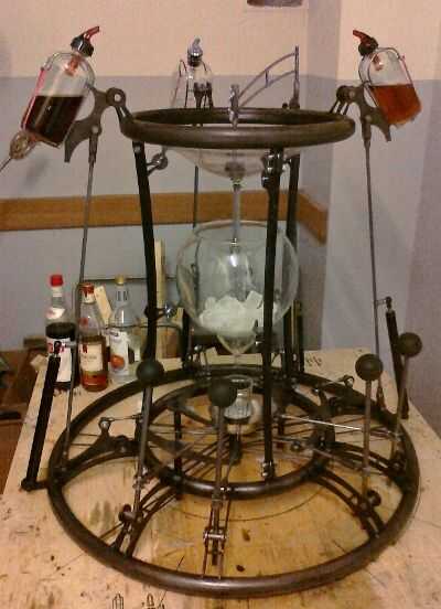 esta máquina mezcla un cóctel de cadáver Reviver #2. Como parte de una residencia de artista en Viena construido en 2009 con el grupo Monochrom, que, junto con el grupo Shifz, organiza el evento de Roboexotica cada año: una fiesta de Cóctel mezcla robots, etc.. Cuando se le preguntó a diseñar una máquina del coctel, rápidamente decidió que el desafío más grande sería mezclar y enfriar los ingredientes. El diseño que ves es mi solución a este problema: mantener los ingredientes, liberarlas a través de un difusor sobre el hielo, luego recombinar en un embudo. La idea para el cóctel de vino de mi hermana Caitlin, un genio de cóctel y prestado el tema de la alquimia medieval creado por la cristalería y las piezas de acero ennegrecidas.