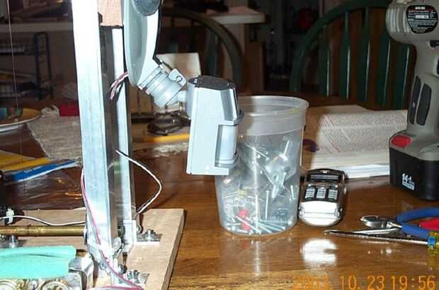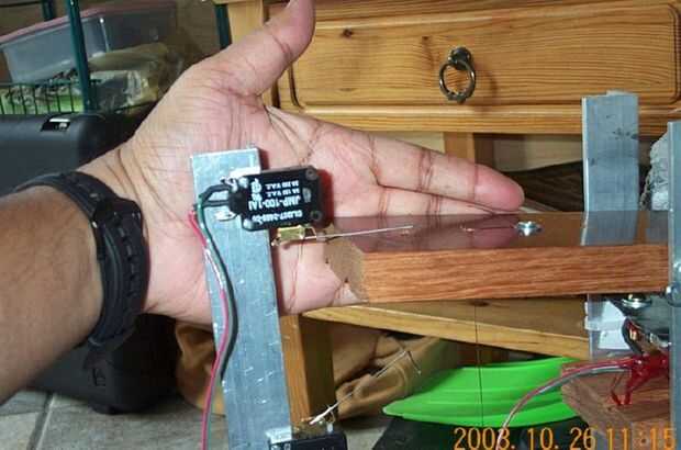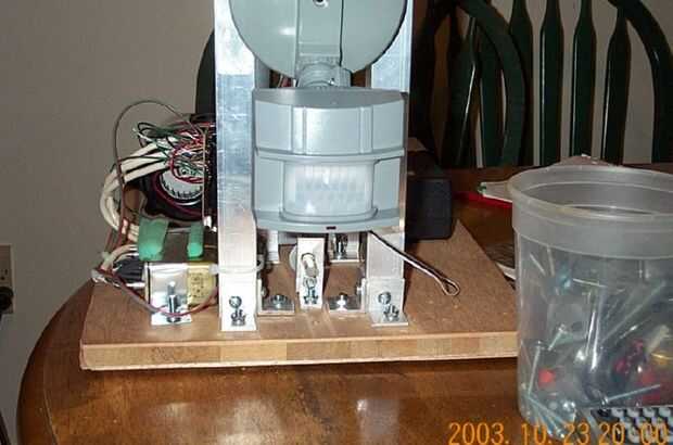 Para un entusiasta electrónico diseño un movimiento sensor probablemente será una brisa. Sin embargo, tuve que encontrar una solución barata sin que sea un gran proyecto como el eje del motor. Cogí un kit de detección de movimiento baratos luz del barrio Home Depot por $15. Usted pudo haber visto el uso de estas luces fuera de los garajes. Allí participó un pequeño reto. La unidad, como se la despacha desde el factor debe encender o apagar una fuente de 110 voltios AC. Si te fijas en mi esquema, no necesitaba el sensor de movimiento que me suministro de un normalmente abierto () salida de tipo pulsador. Esto necesita algunos hacking. Así que abrí la unidad del sensor. La unidad del sensor es bastante simple. La electrónica activa o desactiva un relé. El relé es un solo relé contacto normalmente abierto. En el circuito, el hilo caliente (negro) fue conectado a un extremo del interruptor de relé. El otro extremo salió como un hilo rojo. Obviamente cuando se detecta el movimiento de la bobina del relé se enciende el interruptor y proporciona jugo mediante el cable rojo. Yo corte con cuidado la tira de cobre laminada en tablero del circuito impreso, que se conecta el cable caliente a un extremo del interruptor de relé normalmente abierta. Usando un multímetro, revisar y volver a comprobar el contacto para asegurarse de que no estaban conectados. Soldar un cable verde hacia el corte del interruptor de relé y lo llevó fuera de la unidad del sensor. Por lo tanto, la unidad tiene ahora cuatro hilos que salen de él. Los cables blanco y negro proporcionan el AC de 110V a la unidad para que funcione. El rojo y el verde proporcionan los contactos del interruptor abierto y cerrado, que necesitaba para activar el arranque del motor.