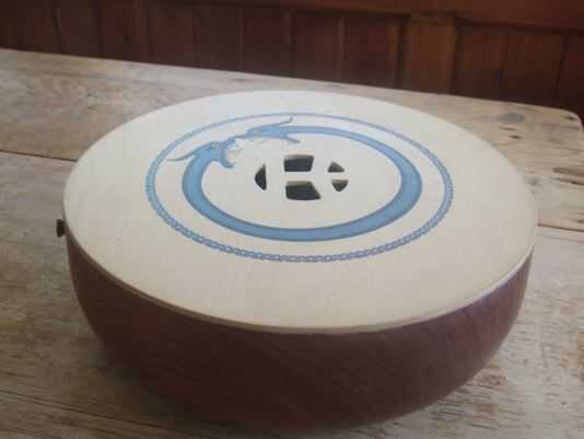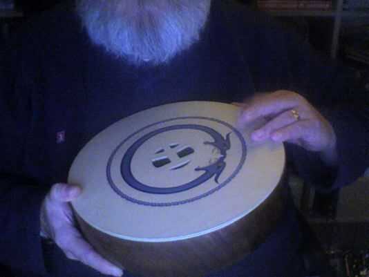 El tazón de fuente es una hermosa madera oscura, aunque no puedo decir qué especies. La 'piel' del tambor siempre fue a partir de madera contrachapada. Yo origen algunas capas de abedul de 3mm hermosa alto grado, que mi amigo cortado con sierras de marquetería, incluyendo el agujero de aire central. El orificio de aire tiene un diseño simple que compone desde su primera inicial y el mío, sólo para ver cómo funcionaría. Calculé que eso si es necesario yo puedo simplemente recortarlo si sentí que estaba causando un problema. Me decidí a experimentar con el agujero de aire, desde el principio, ya que es una personalización que me gustaría ofrecer avanzando con los tambores de la producción.