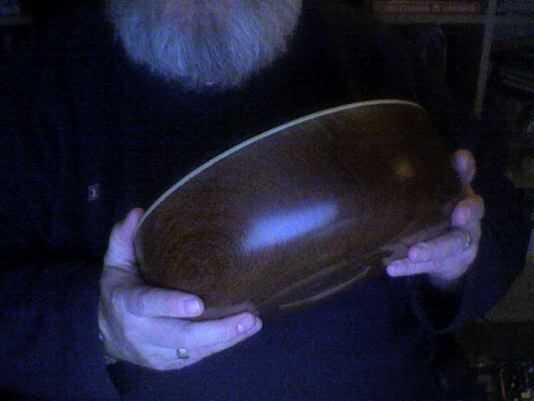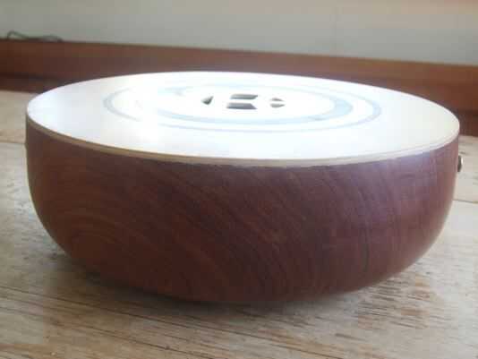Fotos de 1D, 1e, 1f y 2 mostrar el primer prototipo en más detalle. Puedes ver la forma general y el tamaño de la cosa. Es realmente hermoso y juega muy bien. El sonido profundo es en parte hacer con la madera muy densa del tazón de fuente y también la profundidad del tazón de fuente.