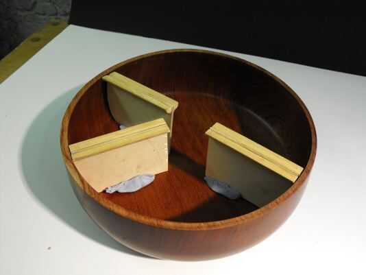 Cuadro 1c muestra la maqueta de los deflectores de temporal dentro de la sopera. Se realizan con Blutack, sólo para el posicionamiento. Más tarde fueron pegados en su lugar.