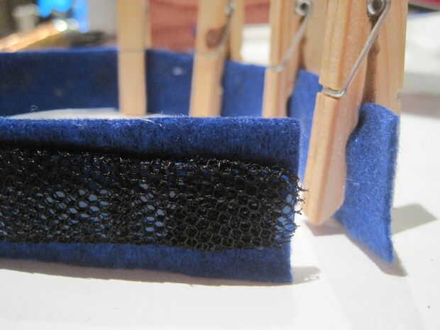 Corte una tira de fieltro de la anchura de la parte más ancha de la venda y bastante a la línea dentro de ella. Como yo tenga que cortar dos tiras de la longitud. Extender unos 5-10 cm de pegamento en un extremo dentro de la venda, y luego oprima el fieltro en su lugar y peg hacia abajo. Otra vez difundió otro 5cm o menos de pegamento dentro de la diadema y prensa/peg el fieltro en su lugar. Repetir hasta que hayas forrado la parte de abajo de la diadema con fieltro. Una vez que el pegamento esté seco (razonablemente) Quite las clavijas y utilizar un par de tijeras pequeñas para recortar los bordes de fieltro a la diadema.