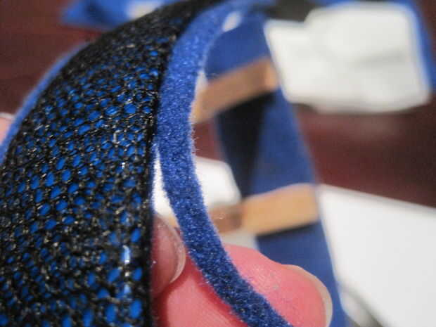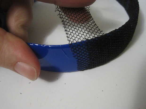 Tomar el azul cinta de embalaje y pegarlo a la banda – no te preocupes las burbujas como se ocultarán por la red. Cortar la malla en un nùmero 2 cm de ancho y comenzar a envolver alrededor de la diadema, superposición de los bordes a medida que avanza. Al llegar al final Sujete la malla con una de las clavijas por ahora.