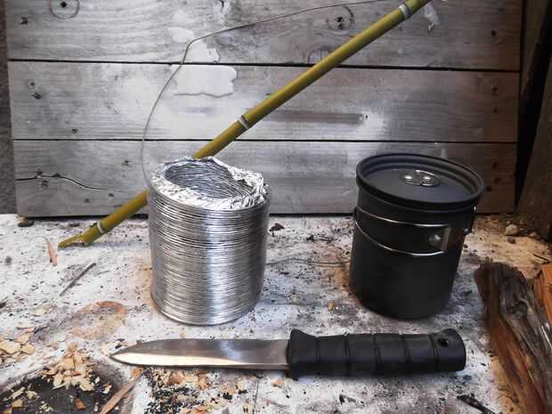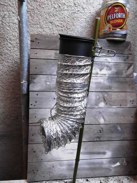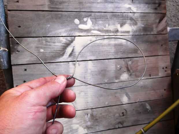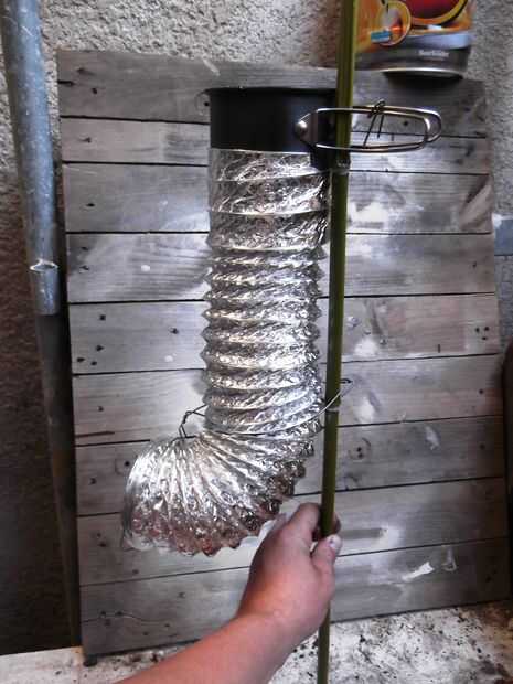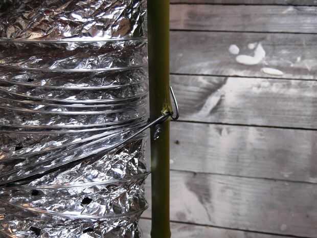 Solidificar el calcetín con un alambre de metal - siempre a tener en su equipo - y fijarla a un palo de madera fresco (usa bambú en esta versión demo).