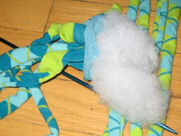 1. Después de rellenar las ocho patas, llene la parte del pie del calcetín (cabeza) con relleno