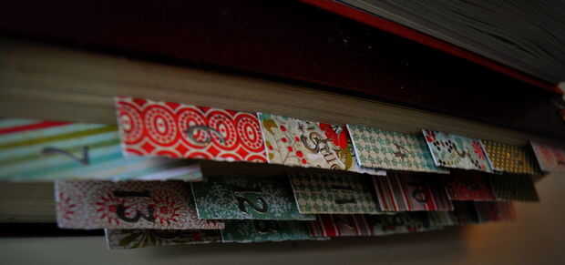 Estaba usando un diccionario y decidió utilizar las páginas que contienen palabras de vacaciones en ellos. Esto creó algo de una búsqueda diaria de la palabra para el niño cuyo turno era abrir la siguiente sección del libro. Esto probó muy difícil de ejecutar; por ejemplo, desea la mayoría de las palabras que en la primera mitad del diccionario (piénsese en el tratar de oblea delgada que necesita encajaría en la página de "Navidad"). El otro factor es que inevitablemente perforados a través de algunas de las palabras fueron planeados, obligándome a meter en alguna tarifa segunda terminología de Navidad (por ejemplo, trabajo en equipo). Una idea que se implementó sobre la marcha fue revelar una porción de una imagen, día a día. En el ejemplo anterior que esto se logró por tener cinco perforaciones sucesivas comenzaron unas pocas páginas, pero todo termina en la misma página. Luego probamos varias imágenes para ver lo que funcionaría también dadas las posiciones y tamaños de agujero.