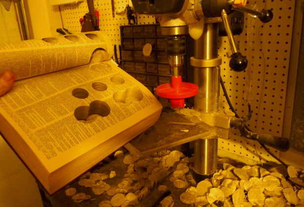 - Tire de espalda a menudo (≈25 páginas) para limpiar los discos de papel de la sierra. Usé un pick con ángulo recto para arrastrar a lo largo de la base del libro atrapado en la sierra. Esto es muy eficaz en la limpieza de la sierra, pero algo peligroso y sucio. El libro va a salir y su selección va a seguir; así que mantenga apretado. Si había olvidado sus gafas en esta etapa, usted recordará ahora.
