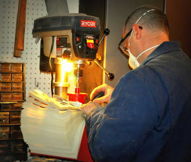 - Bajar la hoja de Sierra de agujero lentamente. Rasgaduras de papel, usted quiere hacer un corte limpio.