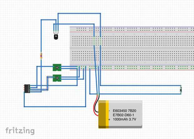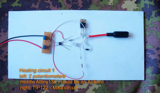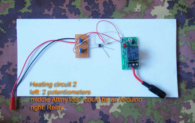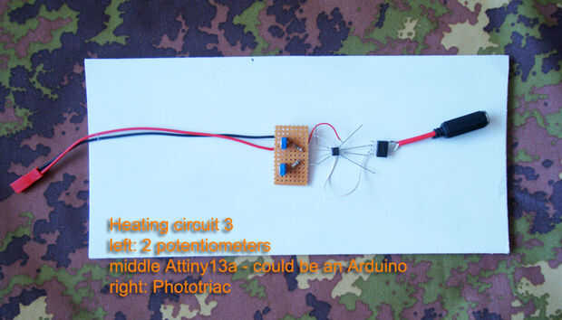 Estos potenciómetros están conectados a los pines analógicos 2. Al lado de eso hay un perno usado como un LED que enciende o no el más grande dispositivo de conmutación (TIP122, relais, Phototriac).Para un inicio rápido puede usar el Arduino para la señalización (cambio en y) y la calefacción, con los 5V del puerto USB.