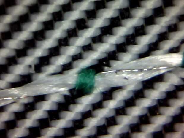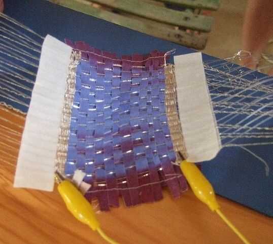 Con un bebé telar de malla tejida de conductores cables y fibras ópticas (combina óptica y efectos crómicas thermo - véase el cuadro), los cables conductores se rompieron y el calentamiento no funciona ya. Fue dañado el núcleo de poliéster y alambre de la bobina metal conductivo con él.