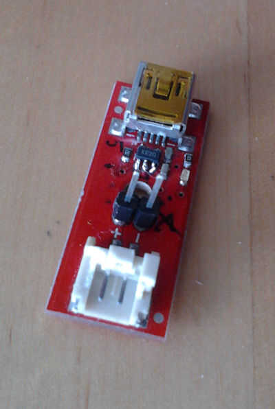 Como se puede ver en la imagen dañado la conexión, (pongo el cable de forma incorrecta: humo! Pero resoldered el chip carga y ahora funciona otra vez: MCP73831T en (un euro) en farnell.com)