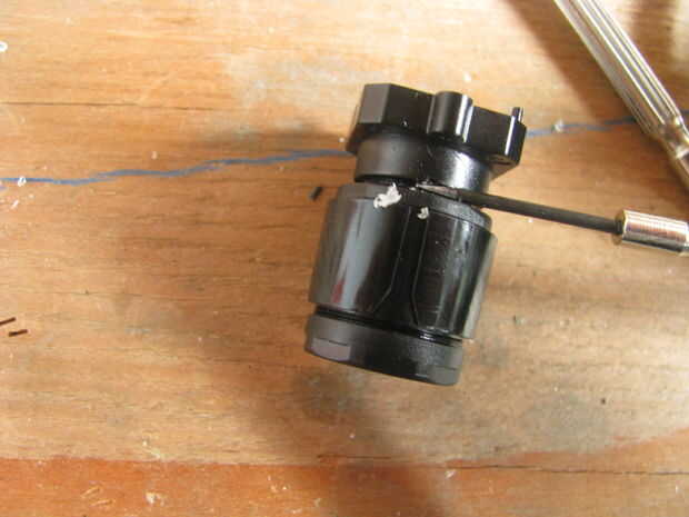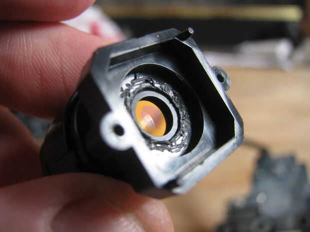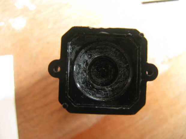 6. Si desea utilizar la montura original de PS3-nativo, necesita separar la lente de PS3-nativo del Monte, que se une con pegamento industrial. Para ello es necesario rayar lejos el pegamento en el borde exterior del Monte. Esto es difícil y requiere paciencia y algo de suerte. Usted tendrá que rayar y trate de girar la lente para desenroscarlo. Mantenga repitiendo este proceso hasta que la lente se separa y puede desenroscarse. Si destruimos la lente (que sucedió a nosotros aproximadamente la mitad del tiempo) usted tendrá que utilizar uno de los montajes de la lente enlazados la lista de piezas.