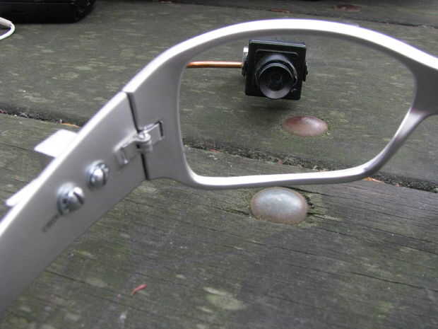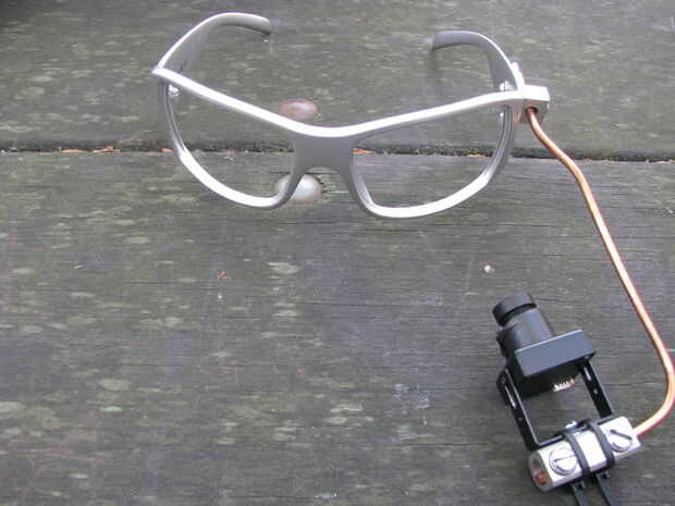 1. colocar el sustrato rígido entre la cámara y la armadura de alambre. La cámara conviene hacia el ojo de las gafas.