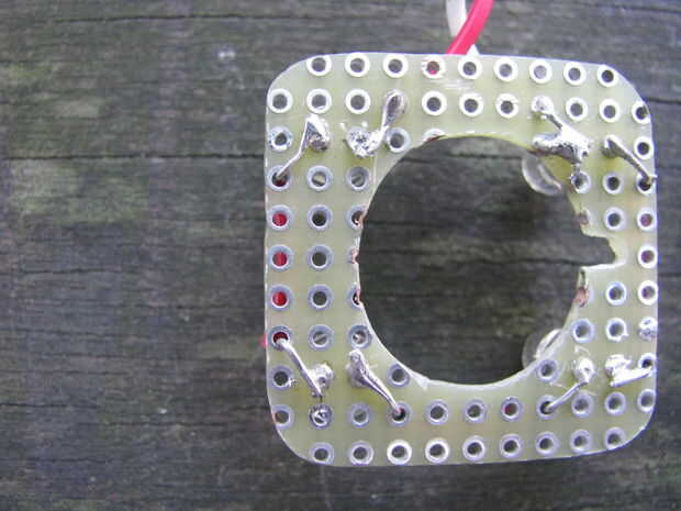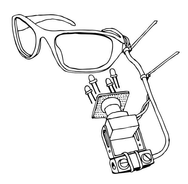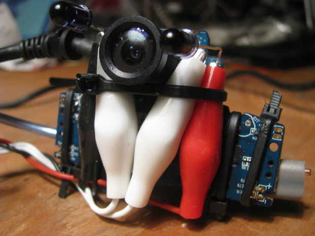 Envuelva el exceso de cable, alambre de atar los cocodrilos en el brazo de los lentes y la armadura de la cámara. Puede utilizar abrazaderas de alambre para sujetar las pinzas al frente de la cámara. Curva los LEDs de IR para que apunten en la misma dirección que la cámara, doblado en hacia el ojo. Asegúrese de que las patas del LED no toquen entre sí o cualquier parte de la placa de circuito de cámara. Puede utilizar cinta aislante para evitar que todos los componentes metálicos aislados eléctricamente uno del otro. Es probable que usted tendrá que ajustar los LEDs IR cuando usted está mirando el ojo en el software cambiando para conseguir una iluminación fuerte que elimina las sombras creadas por los párpados, pestañas y marco cámara.
