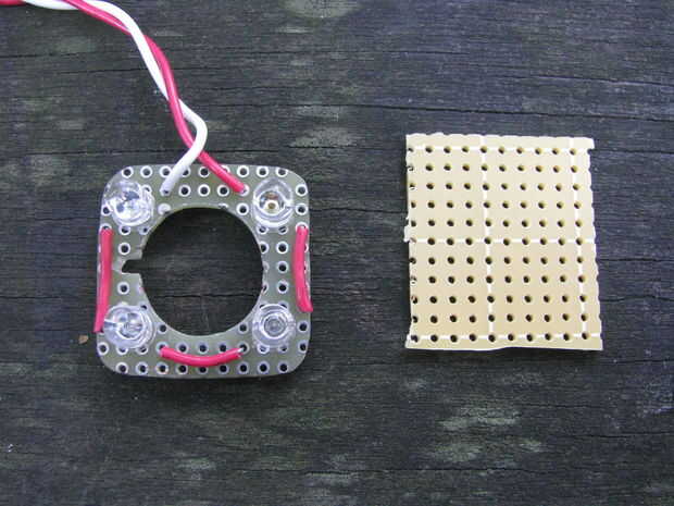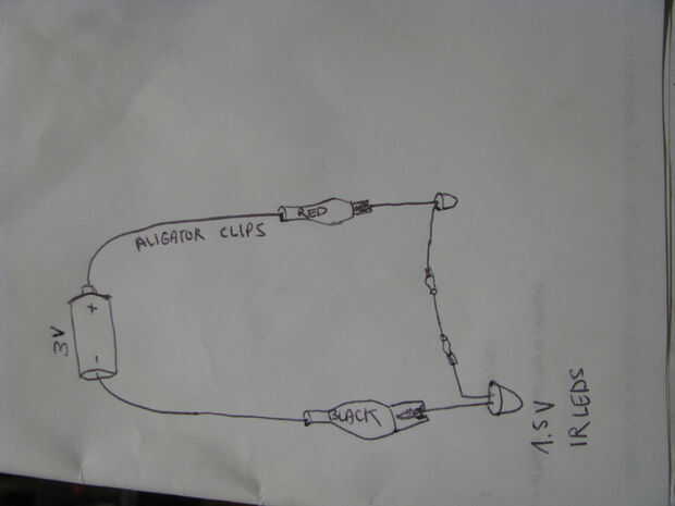 El circuito es un circuito de serie simple de 3 volt con dos LEDs de infrarrojos y una fuente de alimentación (vea el circuito de servilleta dibujo debajo para más detalles). Conectar una pinza, preferiblemente un rojo uno, al poder conducir desde el portapila. Conecte el otro extremo de la pinza a la pata positiva de uno de los LEDs de IR. Conectar la otra pinza, preferentemente blanco o amarillo, a la pata negativa del LED IR mismo y a la pata positiva del LED IR segundo. Por último, conectar una pinza, preferiblemente negro, a la pata negativa del LED IR segundo. El otro extremo de la pinza cocodrilo negra debe conectarse el cable negativo desde el portapila.
