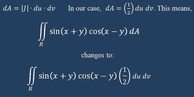 Al convertir integrales dobles en coordenadas polares, cambiamos el diferencial dA con la fórmula dA = rdrdθ.  Para un cambio general de variables no tenemos una fórmula para el diferencial así que tenemos que crear uno.  En cualquier cambio de variables, el nuevo diferencial es que el valor absoluto del determinante jacobiano veces los diferenciales de las nuevas variables de sustitución.  Por lo que en nuestro caso, utilizamos dA = dudv (1/2).