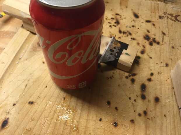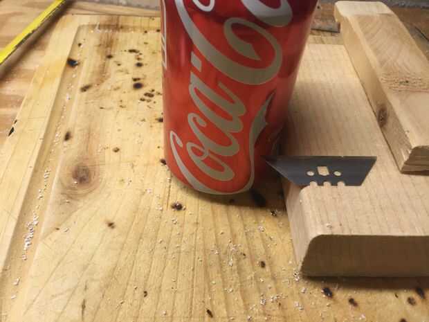 Anotar la lata sujetando una hoja de afeitar a la plantilla que hemos fabricado antes y frotar ligeramente el lado de la lata contra la hoja para un corte bonito y limpio. Hacerlo suavemente y hacerlo hasta que se puede ver claramente una buena puntuación.