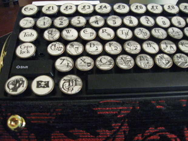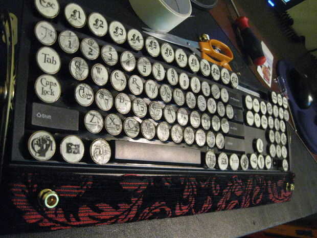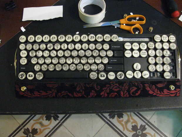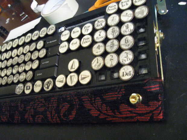 Así que para la parte de plástico del botón del teclado pegué en algunos victoriano mirando la tela y luego screwd dos cabezas de pin correa de guitarra en los lados.