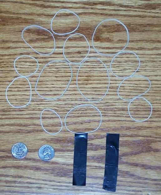 Se necesita: -Algunas bandas de caucho (utilicé 13, pero mi guitarra tiene alta acción). -Dos cuartos de -2 tiras de cinta aislante También necesitaba otra moneda de diez centavos, pero usted no puede.