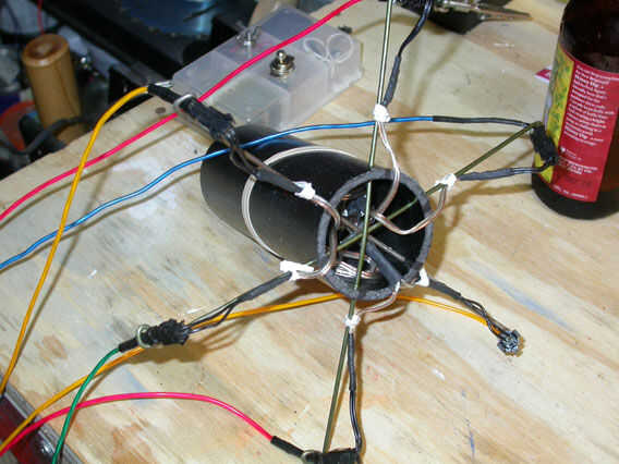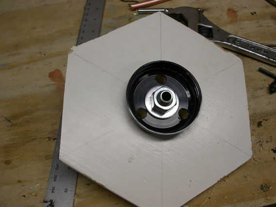 Así, luego he intentado crear una plataforma más estable por cortar una pieza hexagonal de madera. Pensé que sería de ayuda el efecto giroscopio. También ideó una conexión (sobre todo) rígida entre el motor y la parte giratoria. Aún así, no ayuda. El paquete de todo motor/armadura necesita ser rígidamente atado a algo, o la armadura y los cables deben equilibrarse perfectamente. Una cosa que parece ayudar es aumento de peso en la parte inferior.
