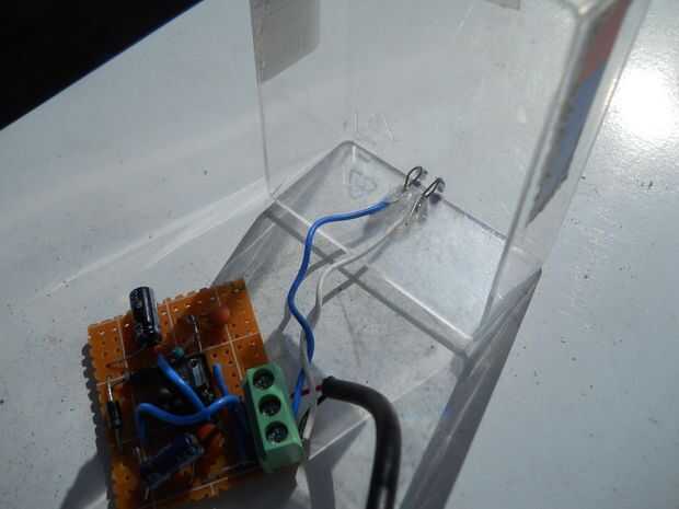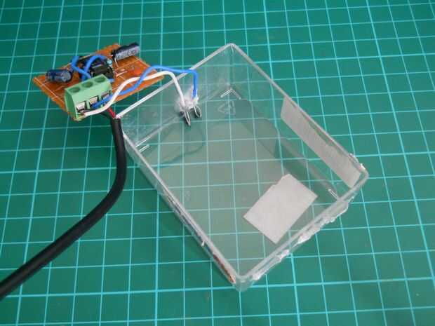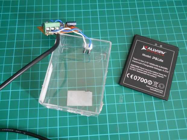 Utiliza dos piernas de un componente electrónico, soldar los cables de salida a él y pegado en la caja con un pegamento. Ponga la batería en la caja, marque los conclusiones positivos y negativos con un bolígrafo y pegar allí los cables. Esto es muy fácil.