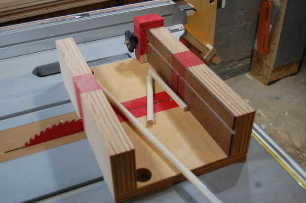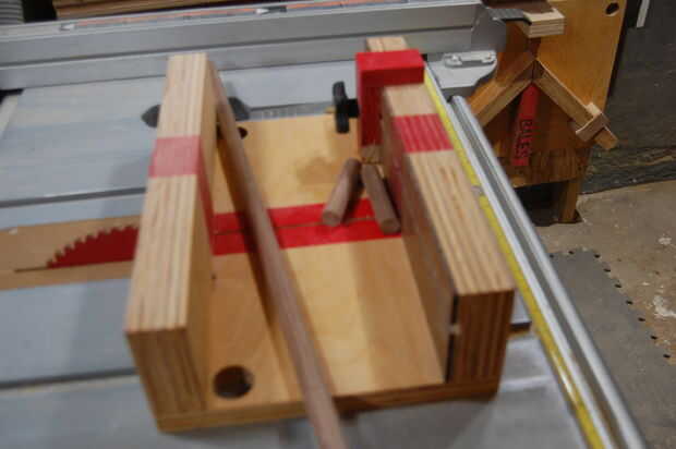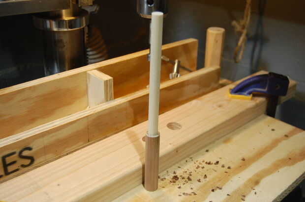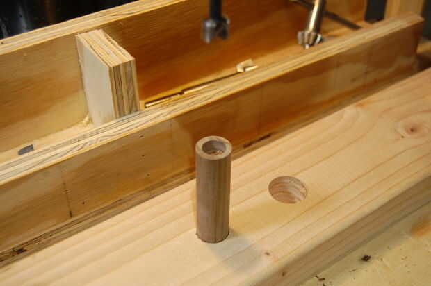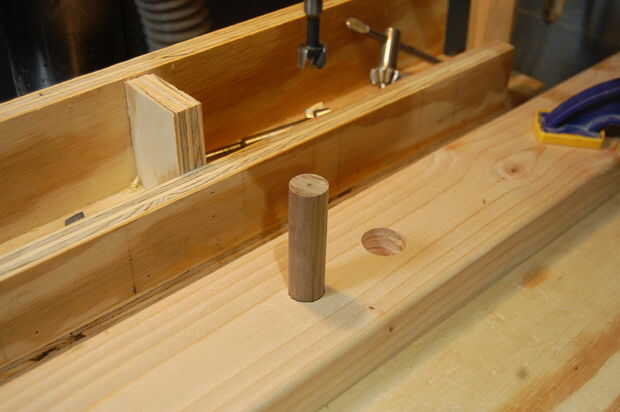 Agujeros deben ser perforados en los extremos de la espiga de 3/4" y necesitaba una manera de guardar perfectamente en línea con la broca. Probé sólo sostiene la espiga con la mano libre, pero no solo trabajo la simple solución fue fijar una tabla de desecho a la mesa del taladro, perfore un orificio de 3/4" en ese tablero, pegue la sección del pasador en que agujero... y luego haga la espiga. Este método efectivamente tiene la espiga en línea y perfectamente centrado.