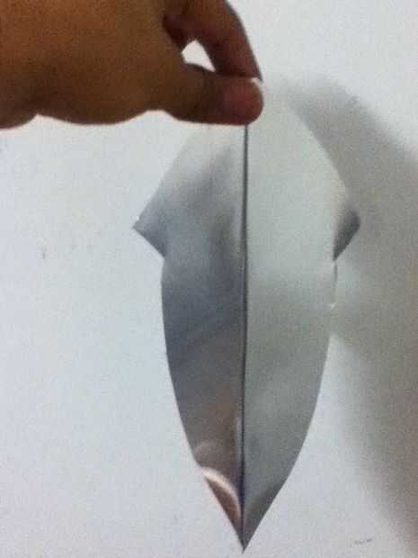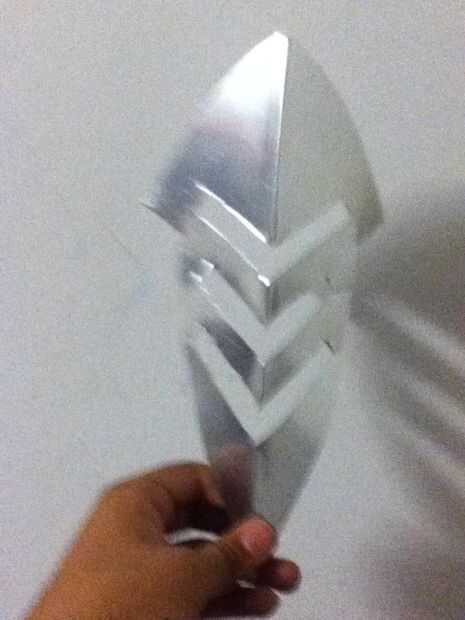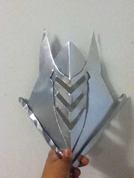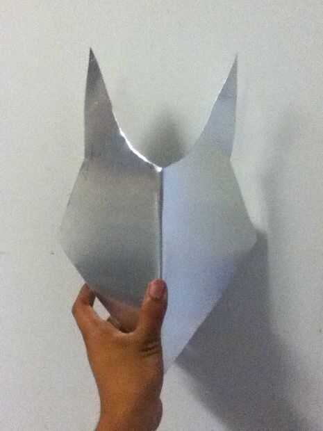 Cortar la pieza anterior. La parte inferior de la máscara debe ser de aproximadamente 5 pulgadas de ancho en el punto más largo y debe ser aproximadamente 8'' de altura, aunque esto puede variar dependiendo de tu cara los cuernos deben ser más altos que los cuernos posteriores, aunque esta parte es principalmente suya. Te recomiendo a partir de grandes cuernos, luego cortar lentamente la hasta que su tamaño es bueno para usted.